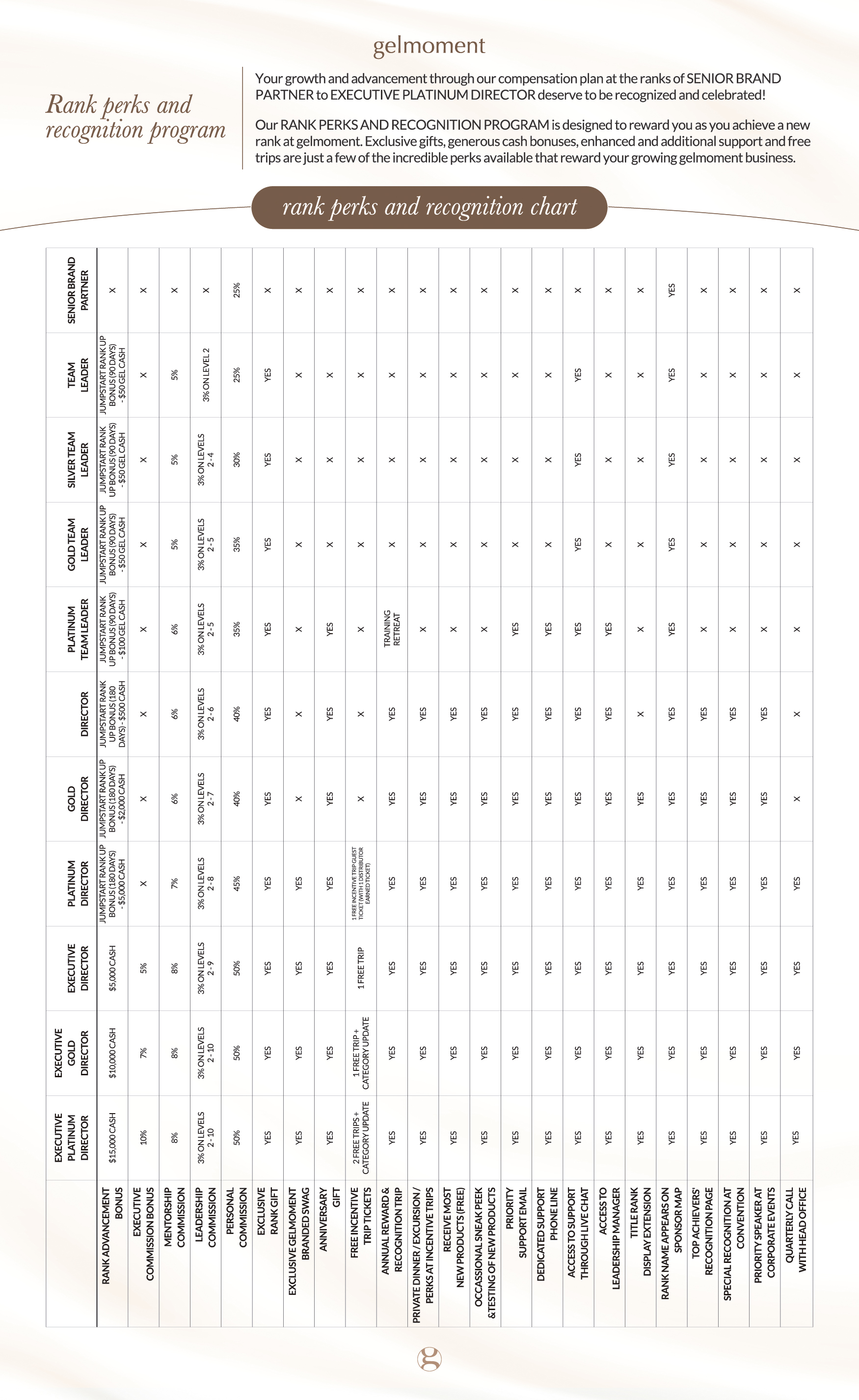 Our RANK PERKS AND RECOGNITION PROGRAM is designed to reward you as you achieve a new rank at gelmoment. Exclusive gifts, generous cash bonuses, enhanced and additional support and free trips are just a few of the incredible perks available that reward your growing gelmoment business.